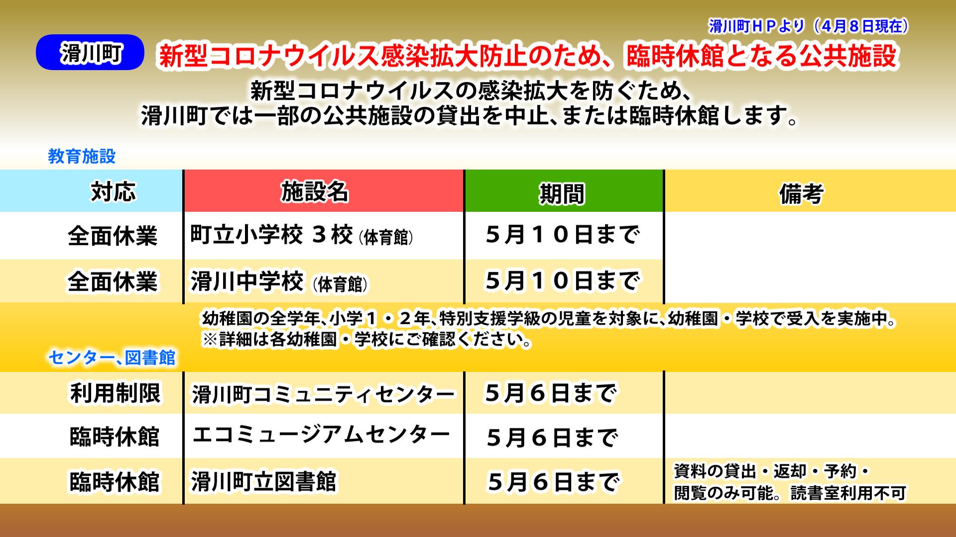 東松山ケーブルテレビ على تويتر 滑川町の公共施設の休館情報です 4月8日現在